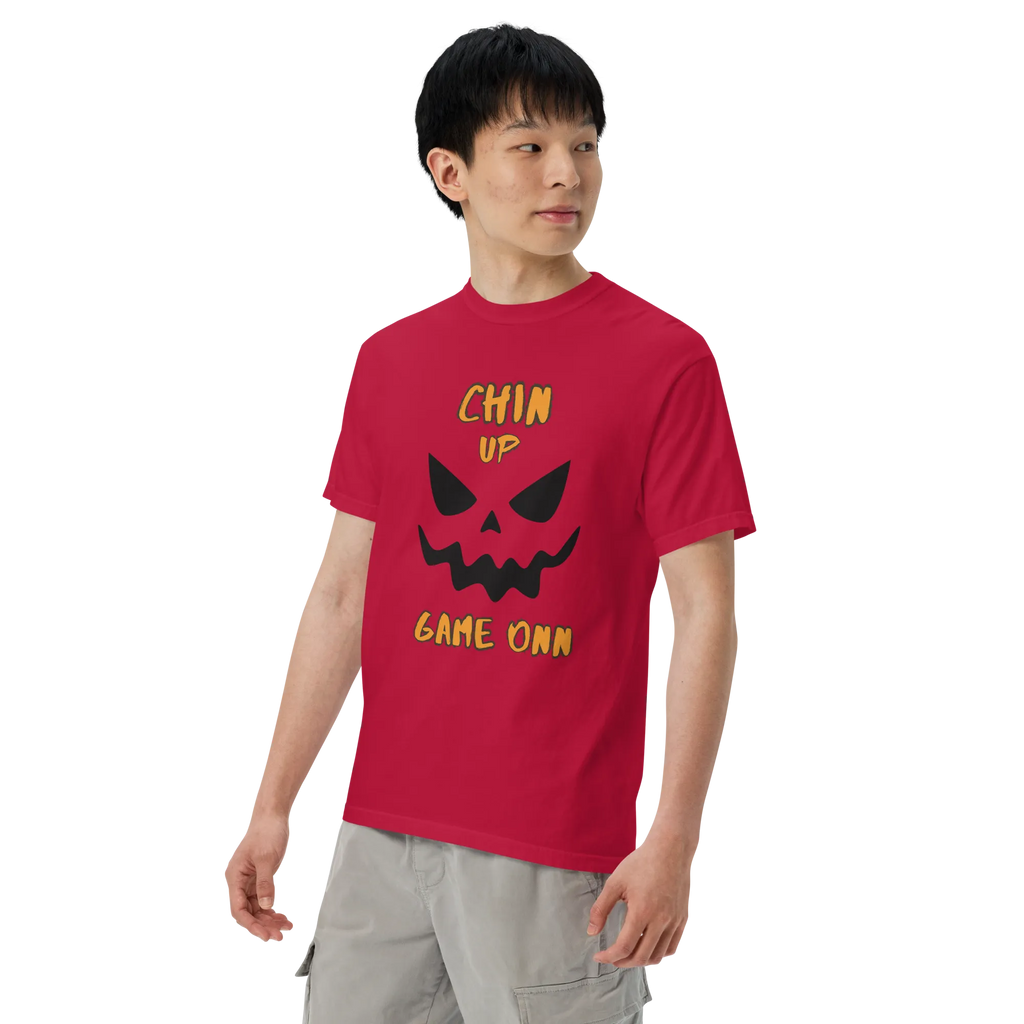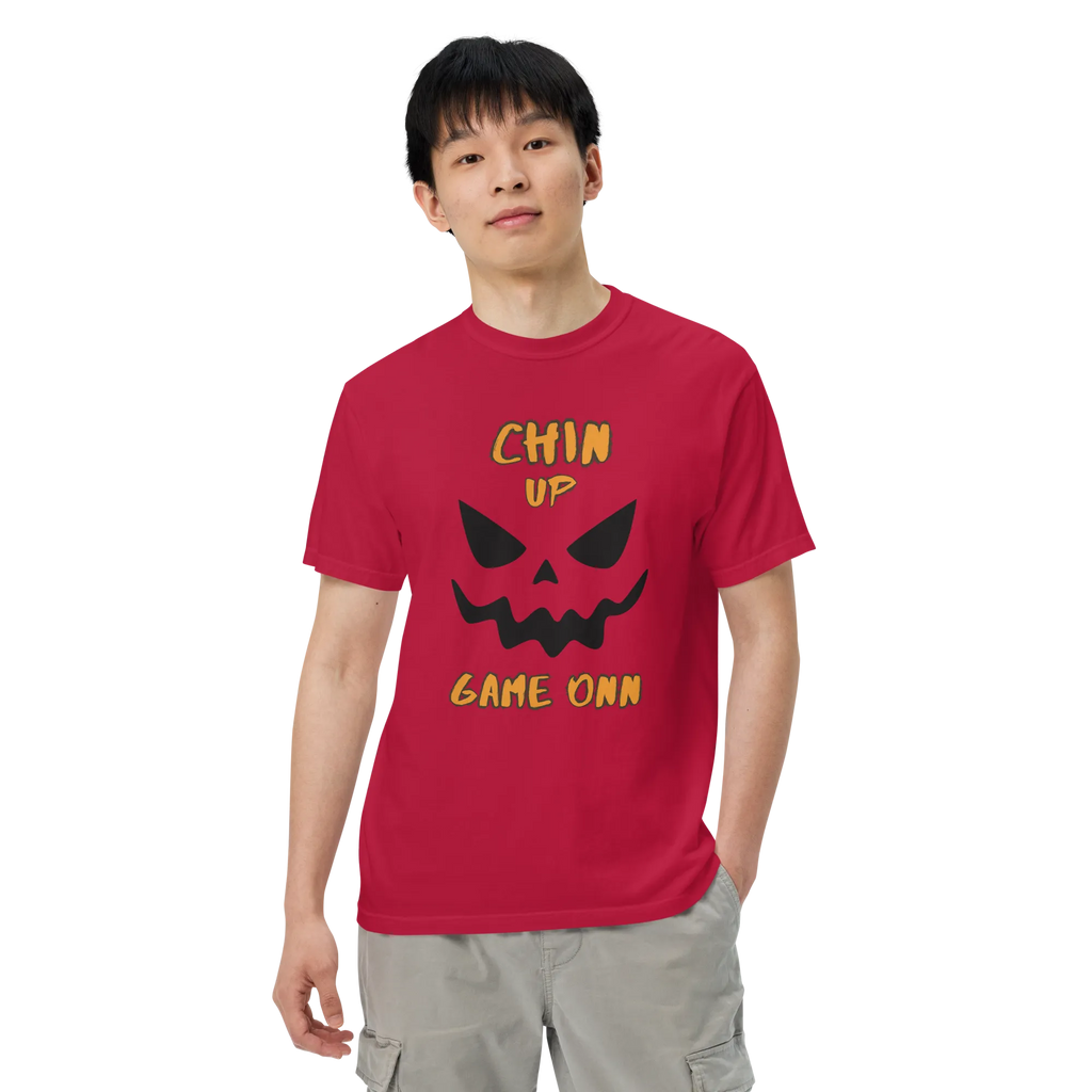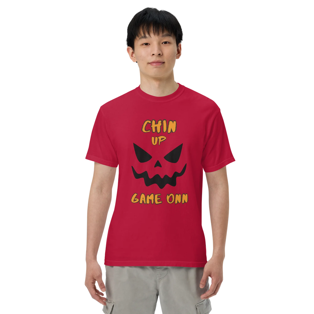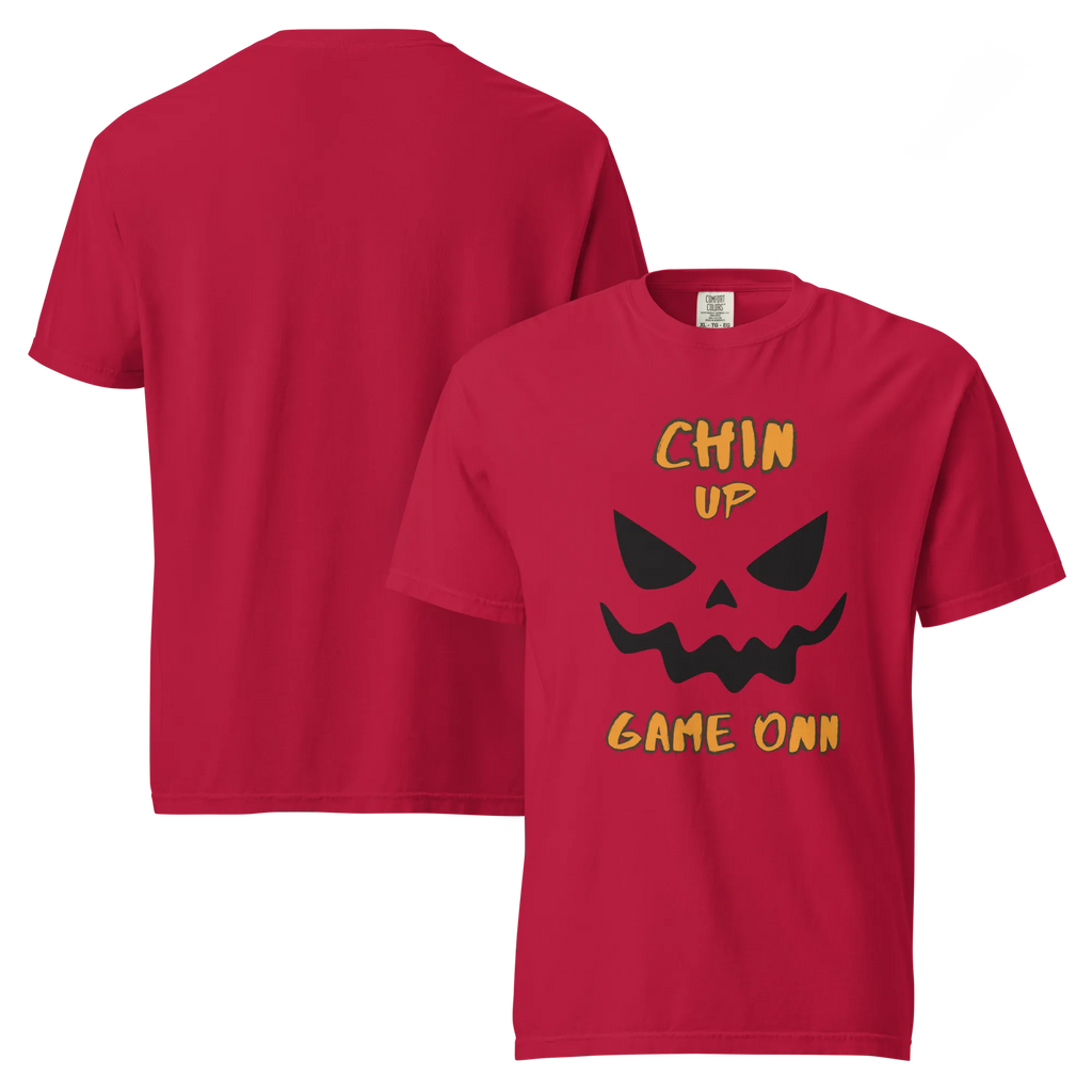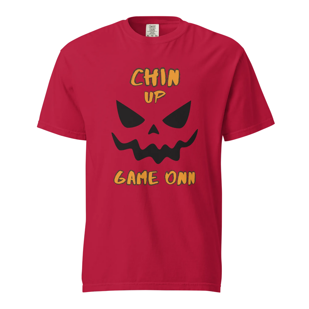 Rise to every challenge with a wicked grin. The Chin Up Game On tee pairs bold, rally‑cry typography with a jet‑black jack‑o’‑lantern graphic—eyes blazing, teeth bared—turning eerie attitude into year‑round motivation. It’s equal parts spooky and sport‑mode, built for players who thrive when the lights get low.