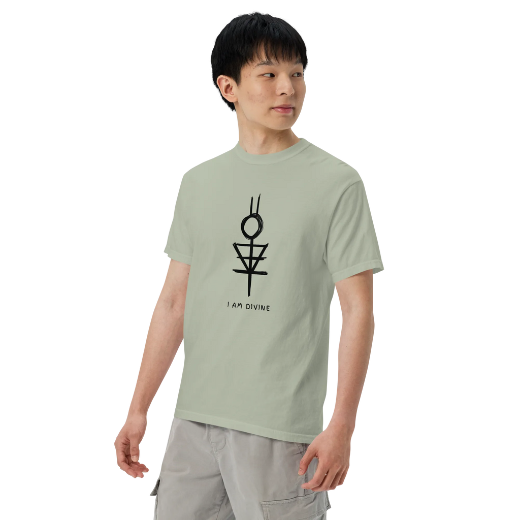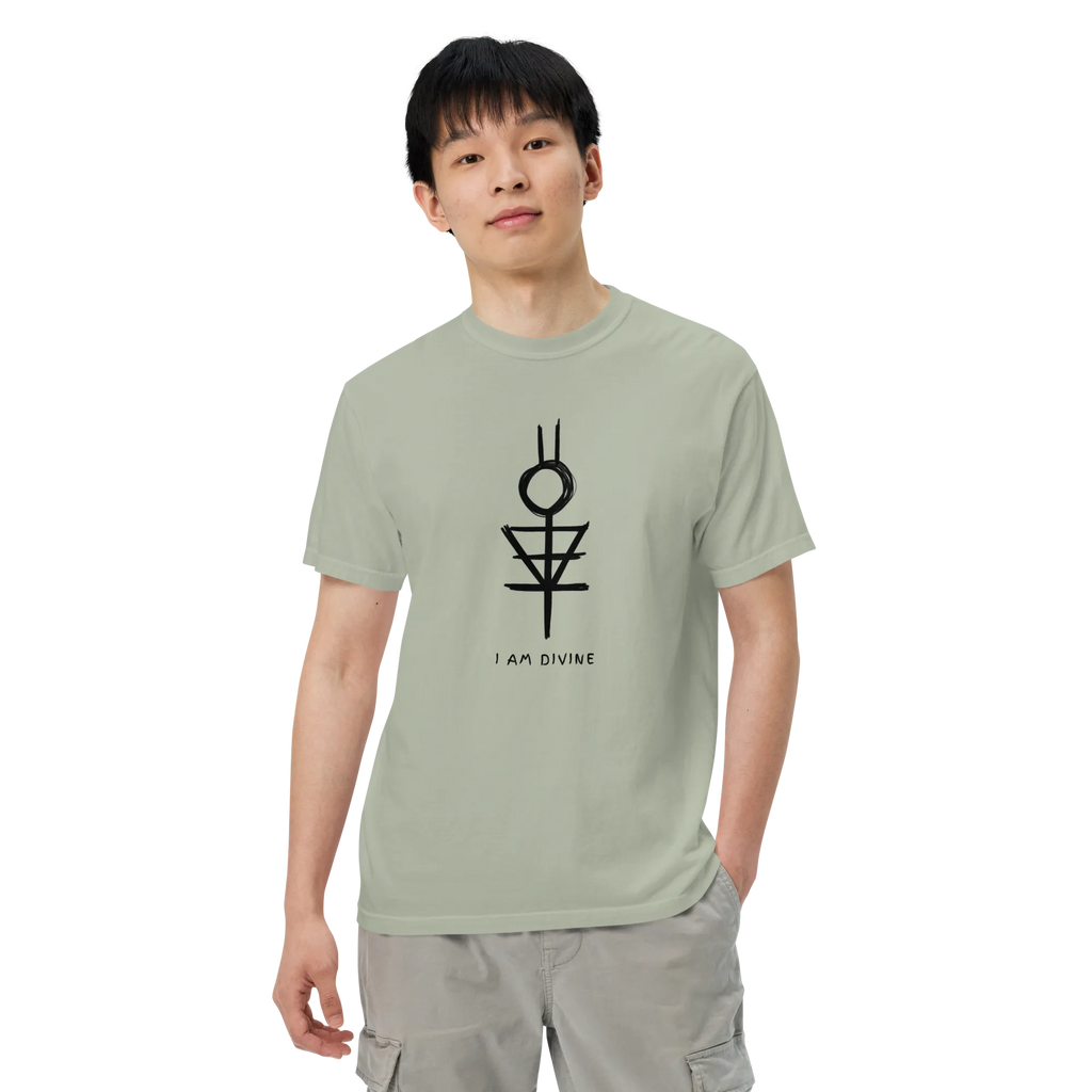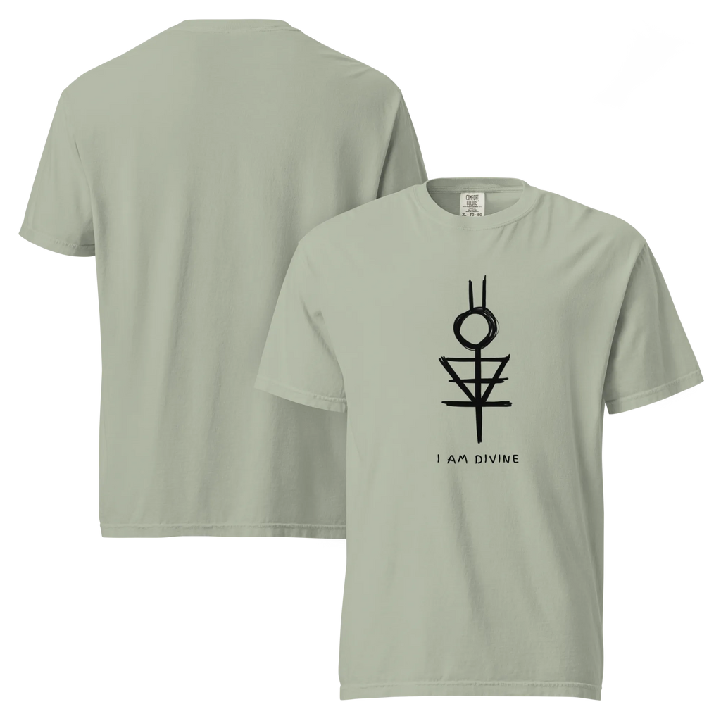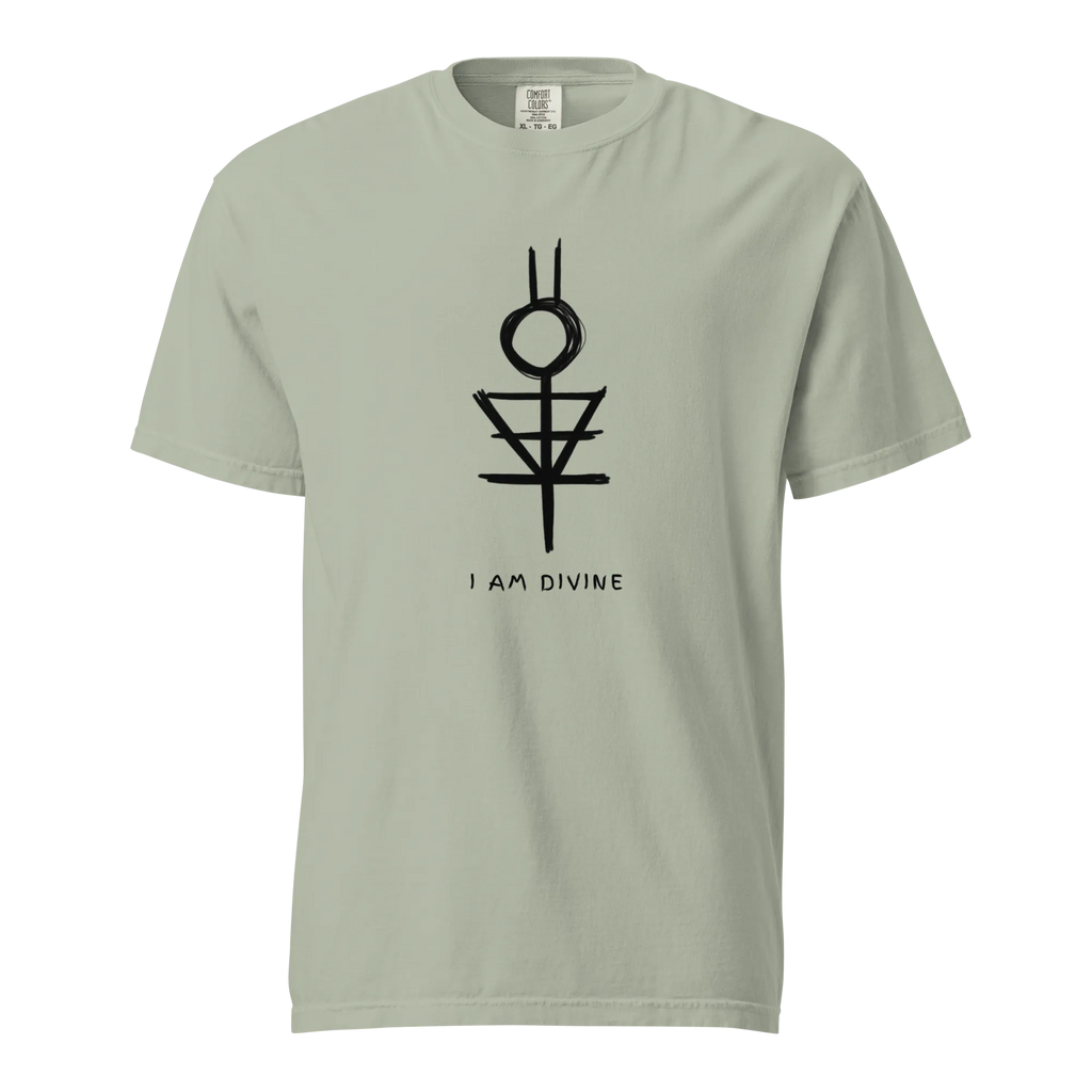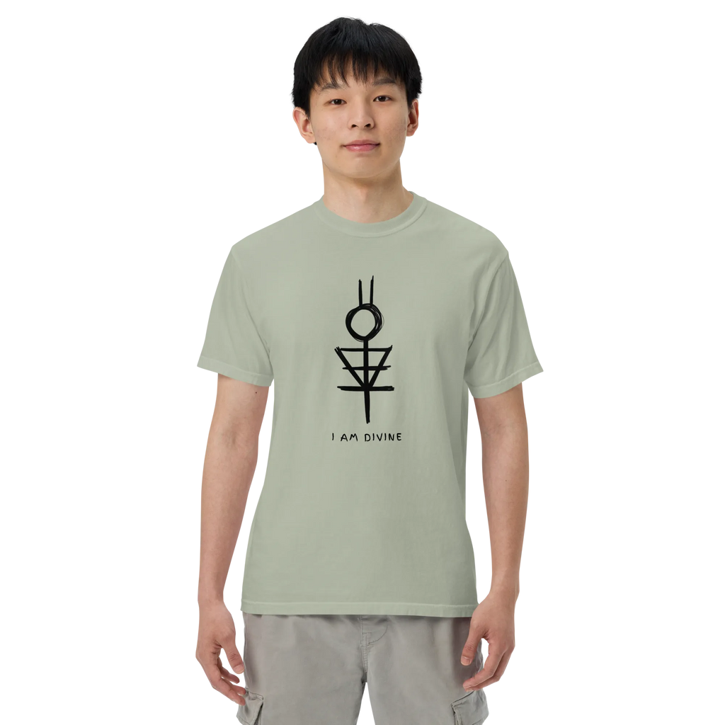 Own your higher nature with the DIVINE tee—a powerful sigil fused with bold proclamation. Centered on the chest, an intricate celestial emblem radiates around the words I AM DIVINE, channeling confidence, purpose, and inner light in one unmistakable design. More than apparel, it’s an affirmation you wear.