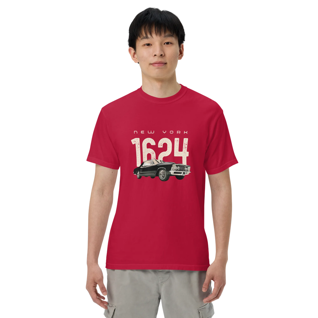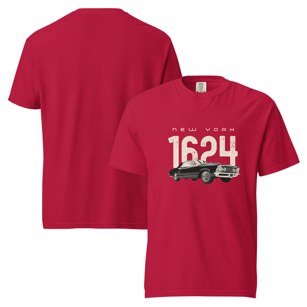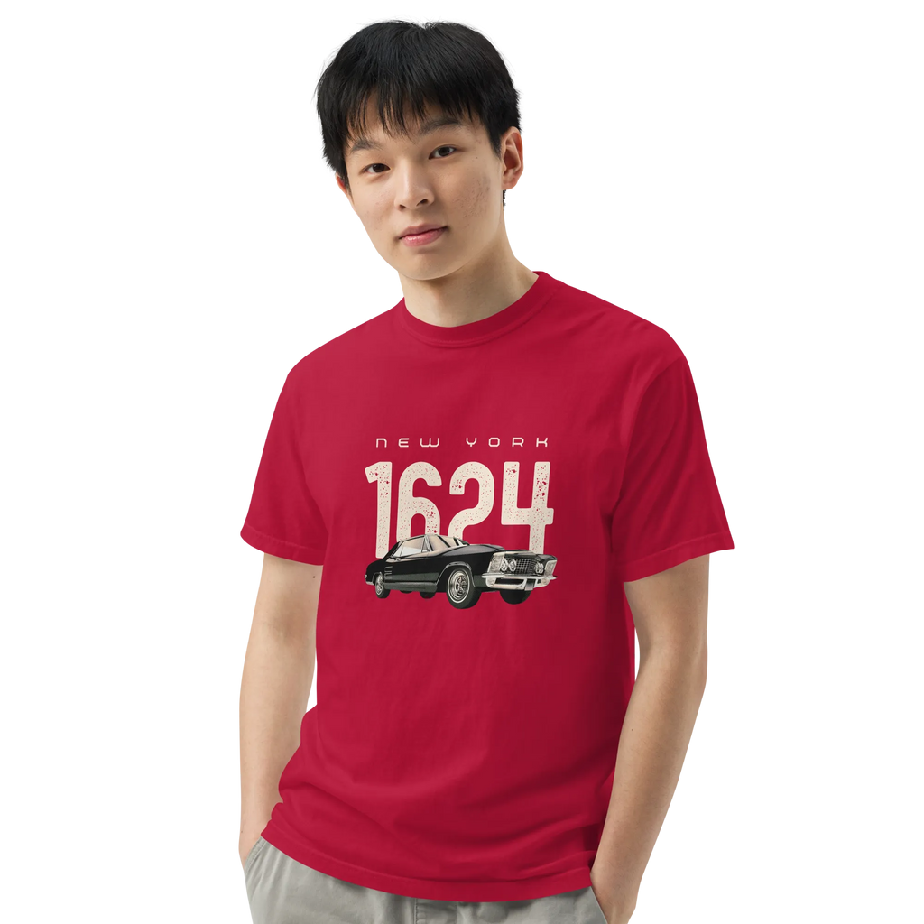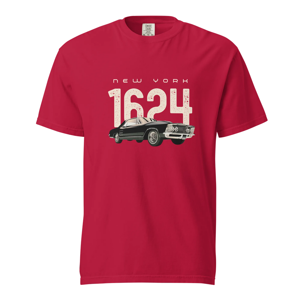 • Timeless Artwork – Bold “NEW YORK 1624” typography framing a classic car—heritage meets horsepower