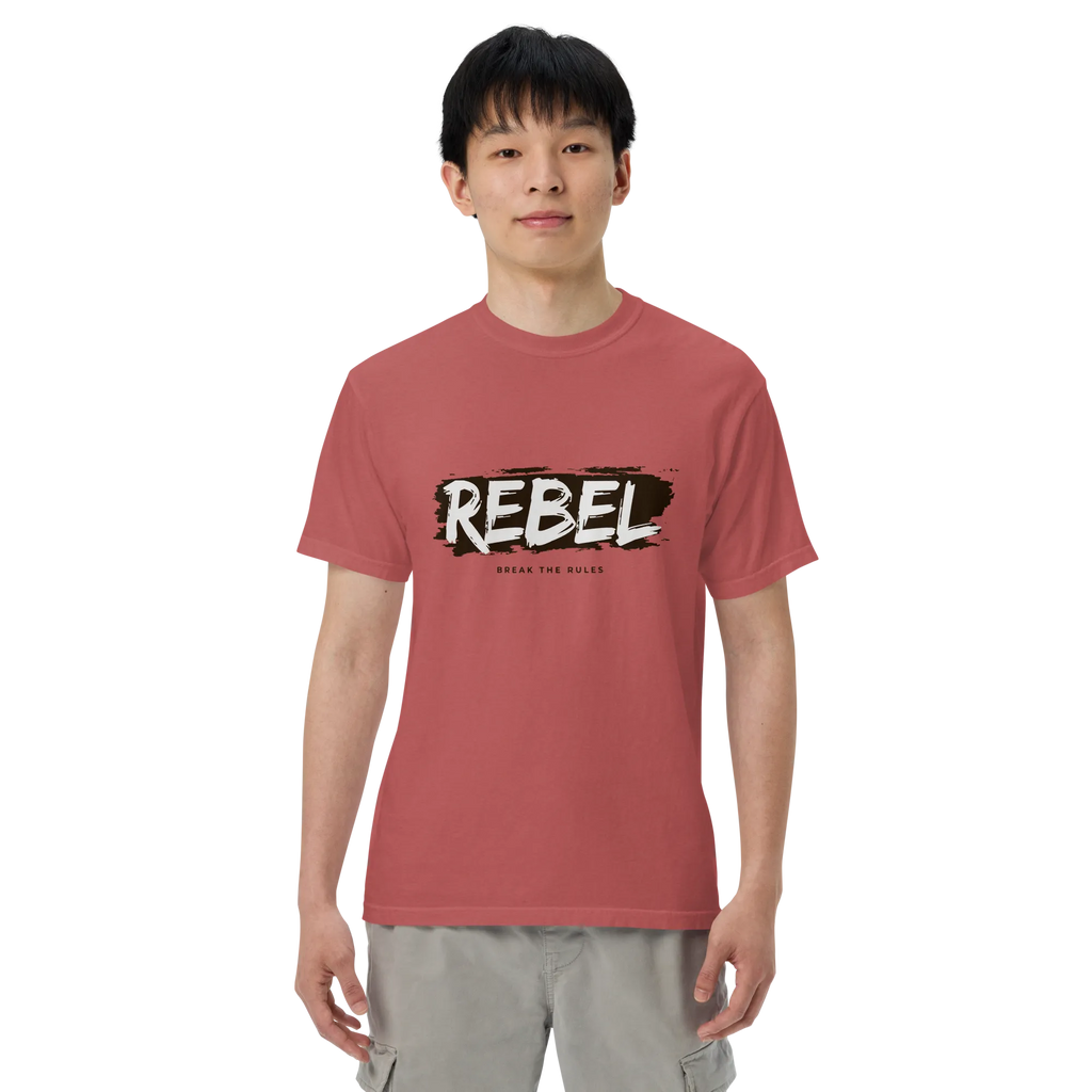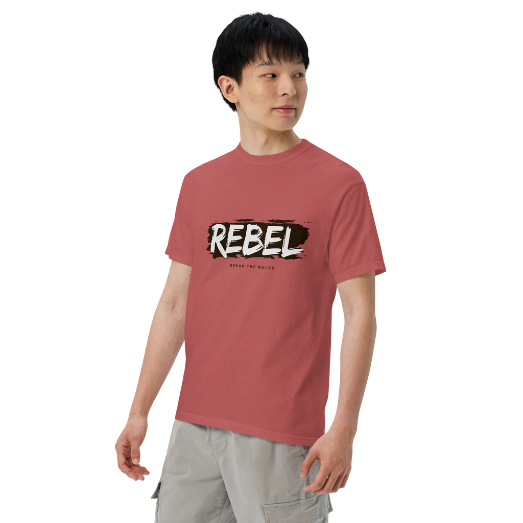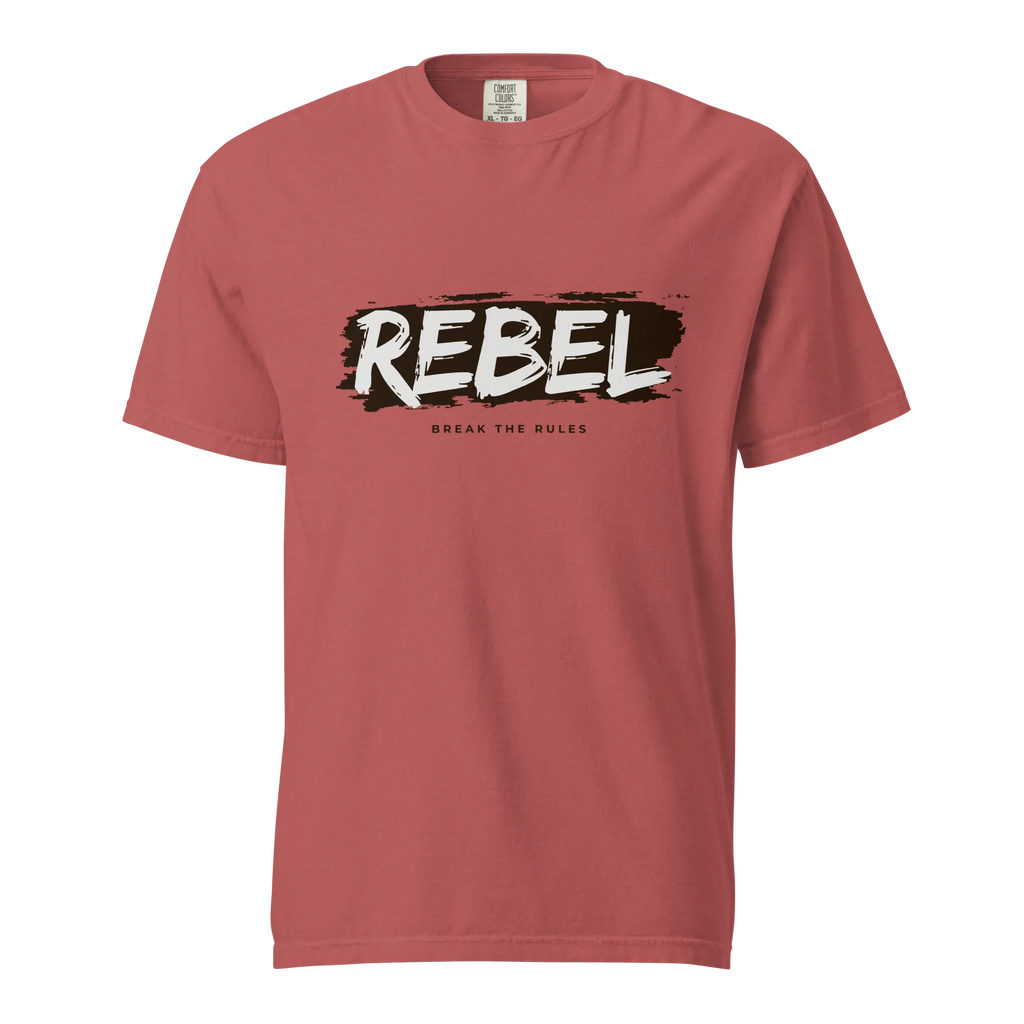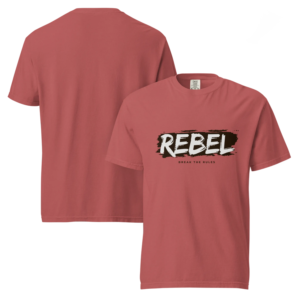 • “REBEL” front graphic + “BREAK THE RULES” caption — minimal, bold, and unapologetic